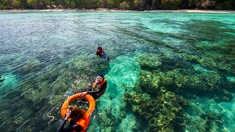 The most outstanding characteristic of Koh Kradan is its clean white beach and crystal clear water that permits a great view of the coral reef underneath. The reef stretched from the beaches northern end to the coast. A variety of colorful fish inhabit the shallow water corals making the site perfect for snorkeling.